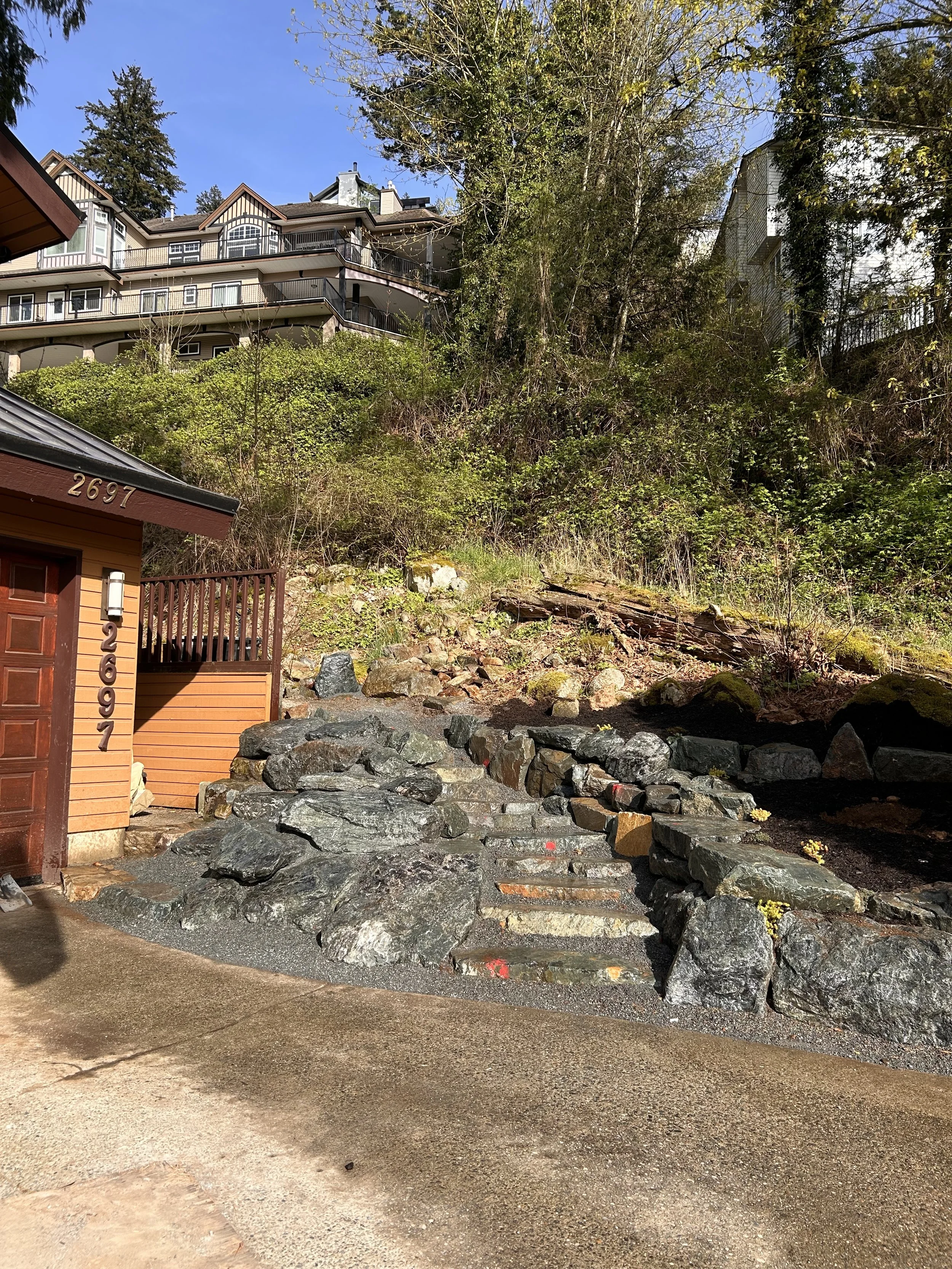 Front yard landscape comprised of lengthy rock walls and gorgeous garden beds, featuring a grand boulder staircase which provides functional access to the home.