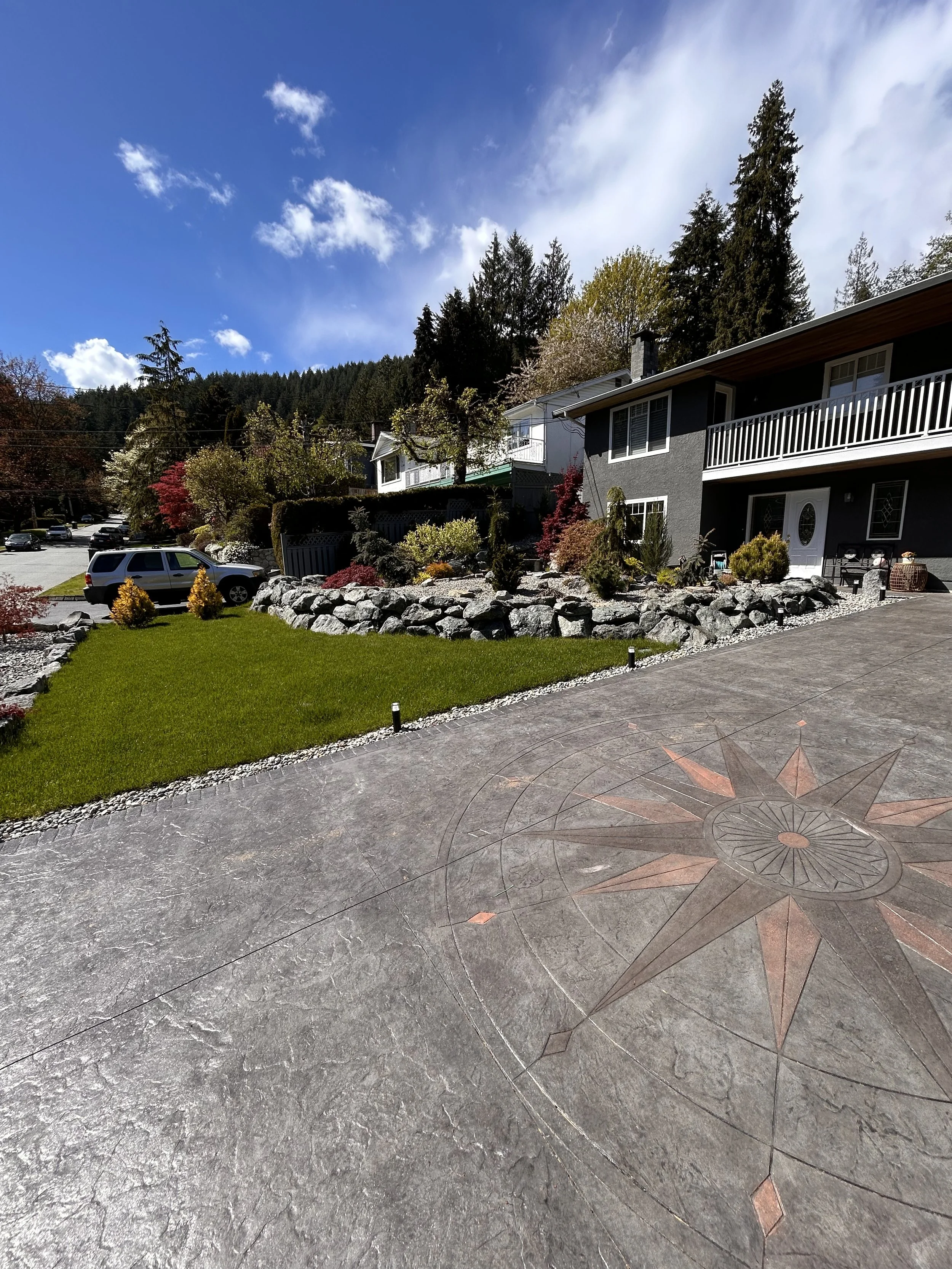 Front yard landscape, featuring intricate rock work, complemented by a beautiful lawn and feature trees, including two beautiful Japanese maples. Expertly finished with a stamped concrete driveway.